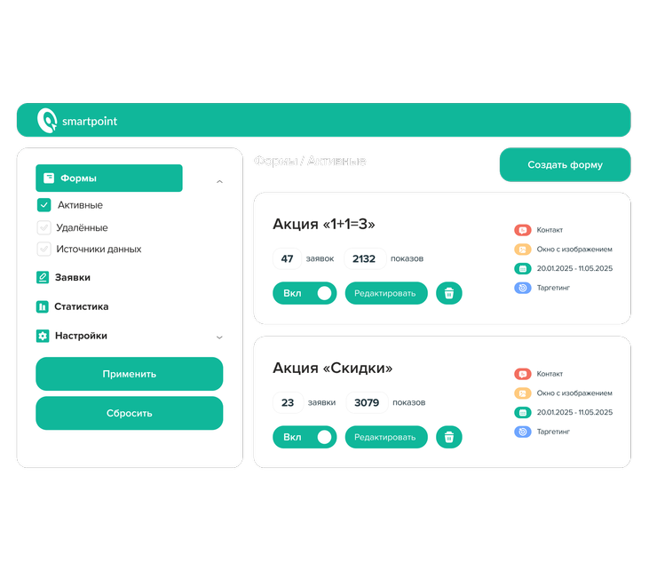 Привлеките больше внимания посетителей сайта с помощью форм Smartpoint и получите рост количества заявок до 30%. Первая настройка форм выполняется бесплатно нашими аналитиками. Доработка сайта не требуется.